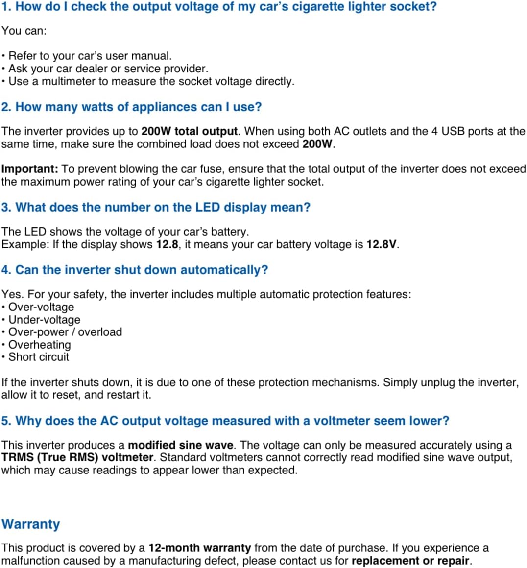 Multi-Protection & Smart Cooling Fan - This Car power Inverter has Built-in multi-protection system which provides full-protection with short-circuit, low-voltage, over-charge, over-voltage, over-load, over temperature protection, built-in fuse. Smart cooling fan makes the car power inverter silent when operating, and it runs faster when it gets warmer. Use this dc to ac converter without any worry.