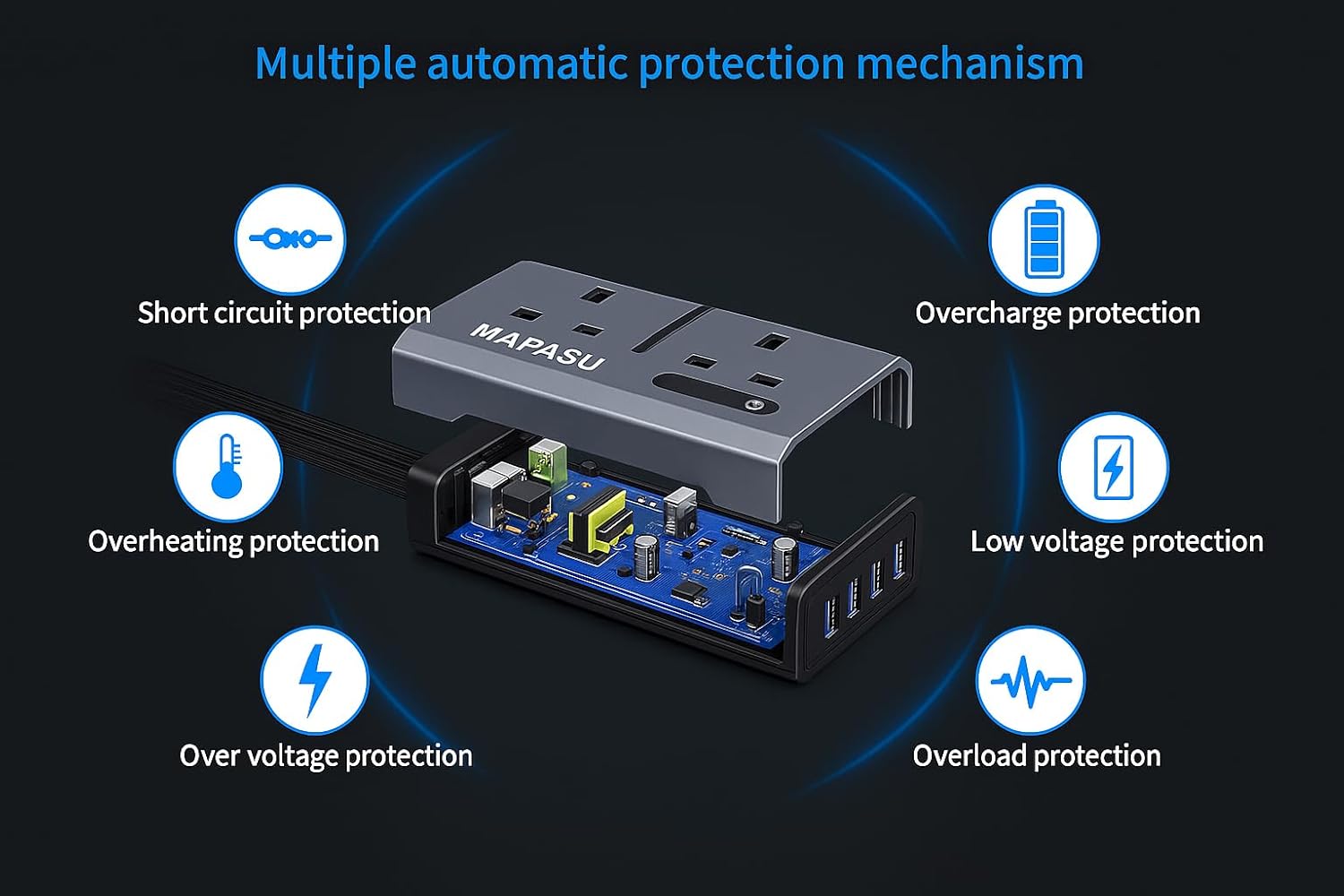 Fast Charging USB - 4 USB charging ports 4 USB ports (2.4A USB+1.2A USB+QC3.0+Type-C), great for fast charging most phones and tablets iPad, Smartphone and other electronic devices Equipped with 4 USB ports can provide the maximum output to 6.2A when power up your electronic devices at once, you can directly charge for your phone, laptop, iPad and camera simultaneously that do not need to turn on the switch.