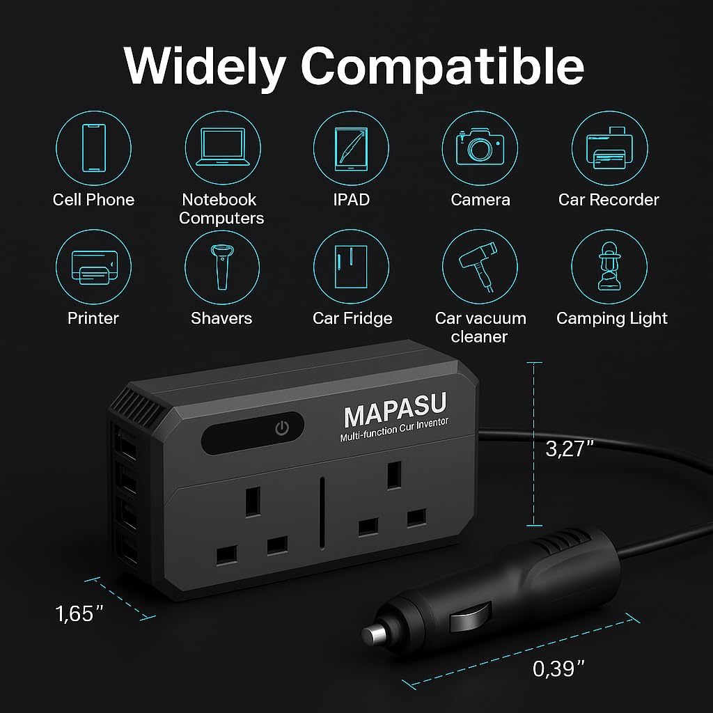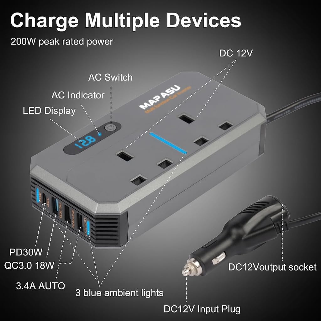 200W DC to AC Power Inverter – 12V to 220V : Convert your car's 12V outlet into 2x 220V AC UK sockets. Dual AC outlets and 4 USB ports (including QC 3.0 fast charging) allow you to power laptops, phones, cameras, and more at the same time.